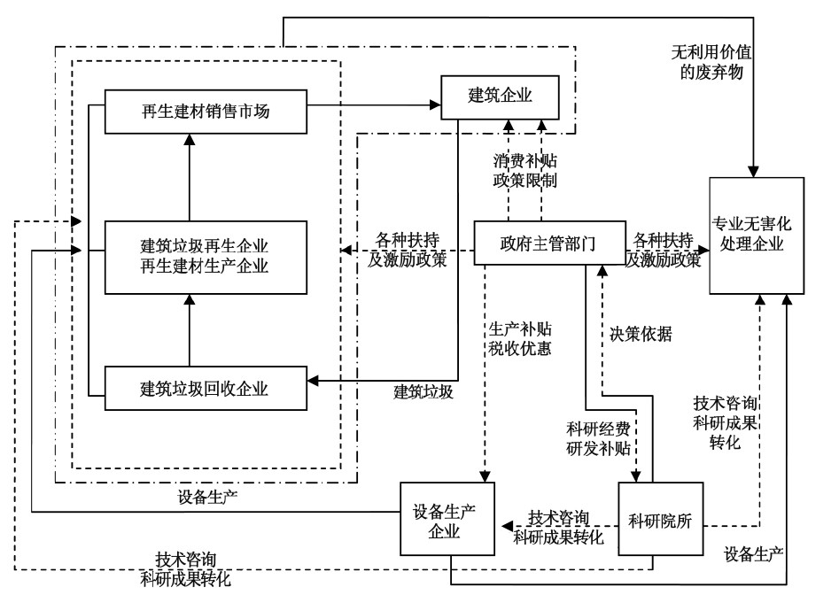 建筑企業(yè)付費(fèi)將建筑垃圾委托給建筑垃圾回收企業(yè)處理。建筑垃圾回收企業(yè)通過專業(yè)化的回收程序進(jìn)行回收和分類,提高建筑垃圾的回收利用率。有利用價(jià)值的建筑垃圾輸送給再生企業(yè),生產(chǎn)再生建筑材料,并通過再生建材市場出售給建筑企業(yè),實(shí)現(xiàn)產(chǎn)業(yè)循環(huán)。無利用價(jià)值的廢物付費(fèi)給無害化處理企業(yè)進(jìn)行無害化處理。設(shè)備制造企業(yè)為建筑垃圾回收企業(yè)、再生企業(yè)、無害化處理企業(yè)提供設(shè)備支持?蒲性核鶠楫a(chǎn)業(yè)內(nèi)各企業(yè)提供技術(shù)咨詢服務(wù),將先進(jìn)的科研成果轉(zhuǎn)化為產(chǎn)業(yè)內(nèi)各企業(yè)的生產(chǎn)力,并為政府主管部門提供決策依據(jù)。
